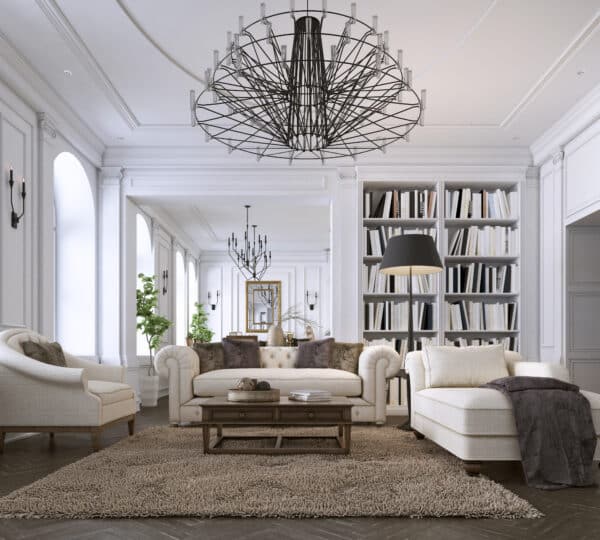 Luxury classic interior of living room and dining room with white furniture and metal chandeliers.